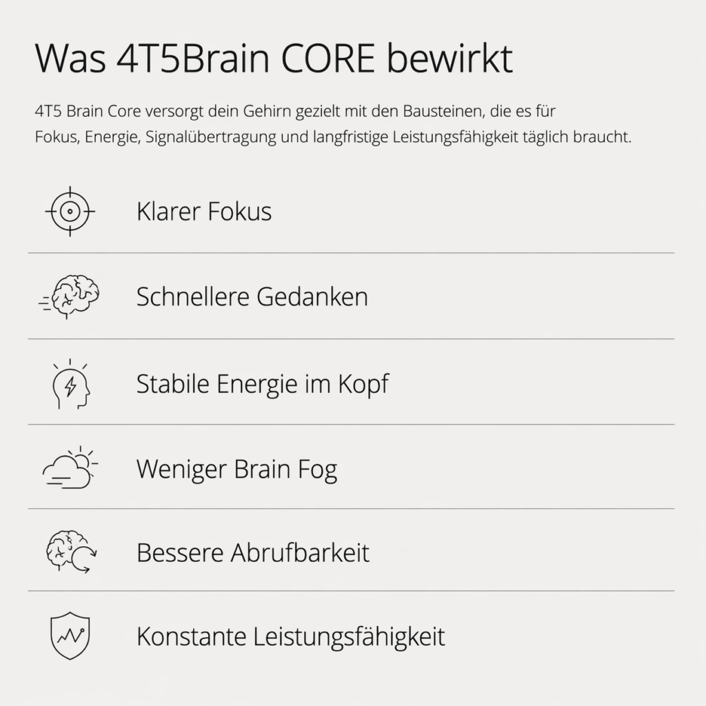 4T5Brain CORE ist für Menschen, die mental viel leisten, erste Veränderungen ernst nehmen und ihr Gehirn täglich gezielt versorgen möchten.