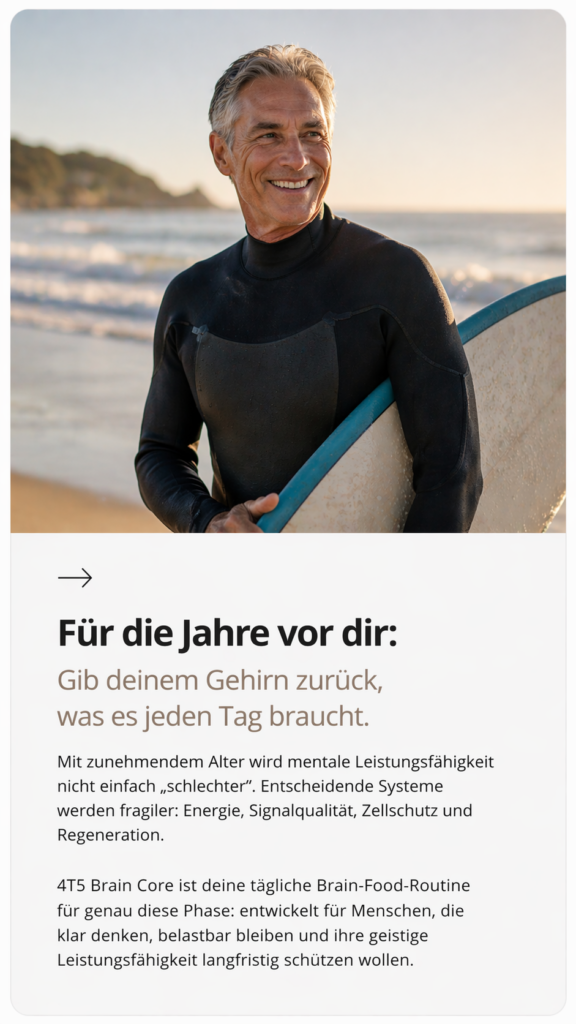Doch ab Mitte 40 reicht „ein bisschen gesünder leben“ oft nicht mehr aus. Dein Gehirn braucht gezielter das, was früher leichter verfügbar war: Bausteine für Zellenergie, Signalübertragung, Membranen, Synapsen und Regeneration.