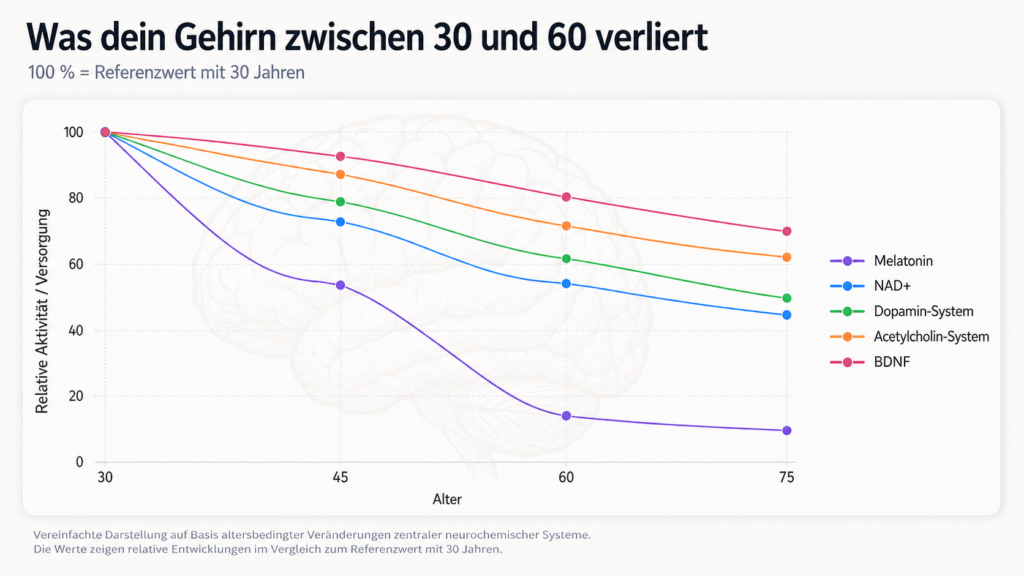 Mit dem Alter verändern sich zentrale biochemische Systeme im Gehirn. Genau diese Veränderung sieht man, wenn man die wichtigsten Kurven z.B. zwischen 30 und 60 betrachtet.